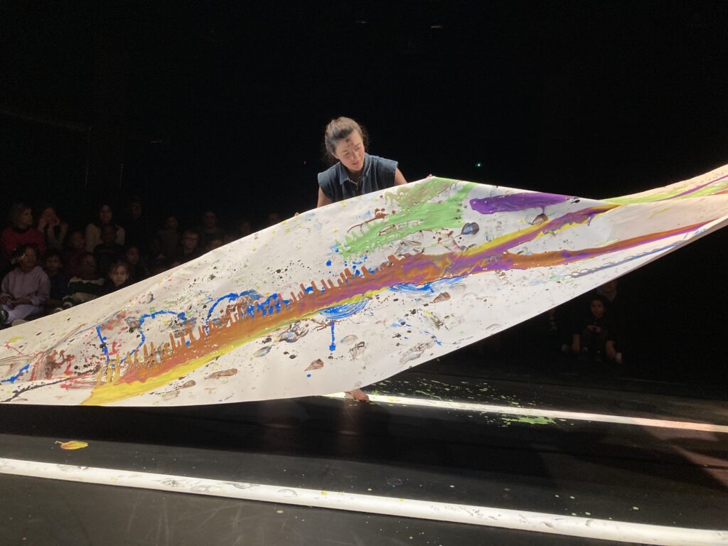 Les enfants à partir de 2 ans ont assisté à un spectacle à mi-chemin entre représentation théâtrale et atelier de peinture Une bande de papier
